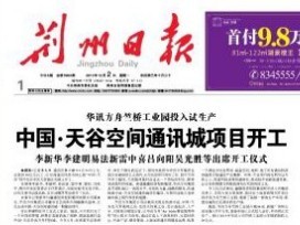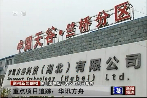 8月11日,荊州電視臺再次采訪并報道了華訊方舟科技(湖北)有限公司竺橋工業園和中國天谷荊州項目進展。 報道稱,近兩年荊州的電子信息產業異軍突起,其中塊頭最大,投資最多